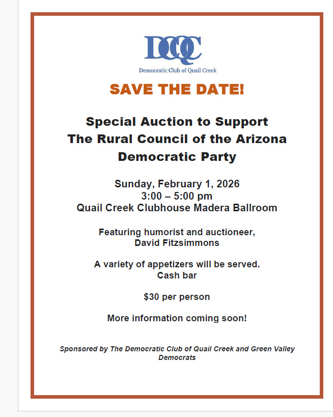 The Democratic Club of Quail Creek is a welcoming and diverse group of individuals living in Quail Creek. Founded in 2012, we are located in the Quail Creek neighborhood, and welcome friends from anywhere to attend our public meetings.